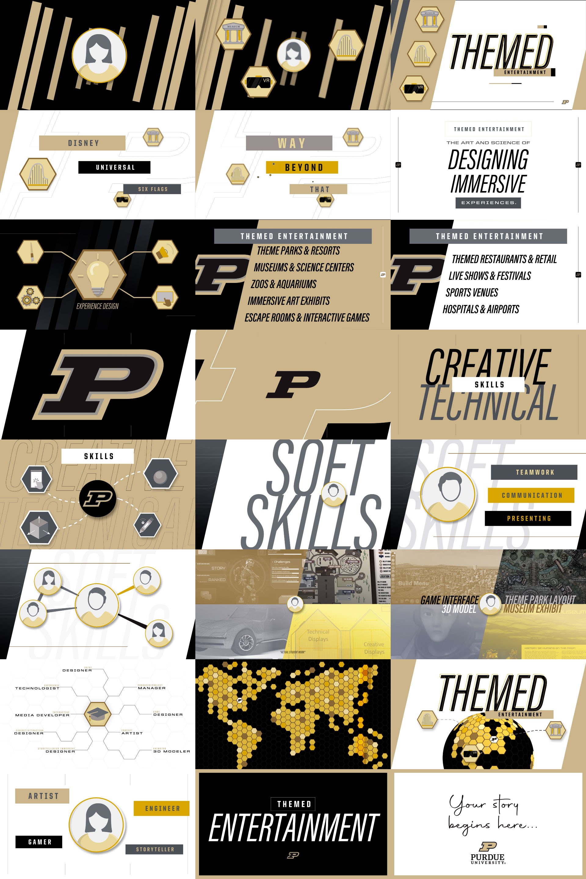 In efforts to help student awareness and enrollment, I was hired to help create an engaging, dynamic explainer video that showcased all of the exciting new opportunities Themed Entertainment & Design had to offer incoming students. With the official Purdue University Brand & Style Guide, I was given a clean palette to design and animate this piece. Keeping within the approved color options, I chose to use a minimal approach while amplifying the use of the diagonal angles that were within the brand. Finally, hexagonal shapes were added to the mix due to the University recently using the shape for their print marketing. From design, to animation, to the final render, the video was completed before the 2025 Fall semester kicked off.